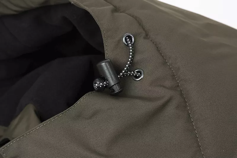 - Hood on jacket is removable and also features high chin baffle with adjustable bungee cords