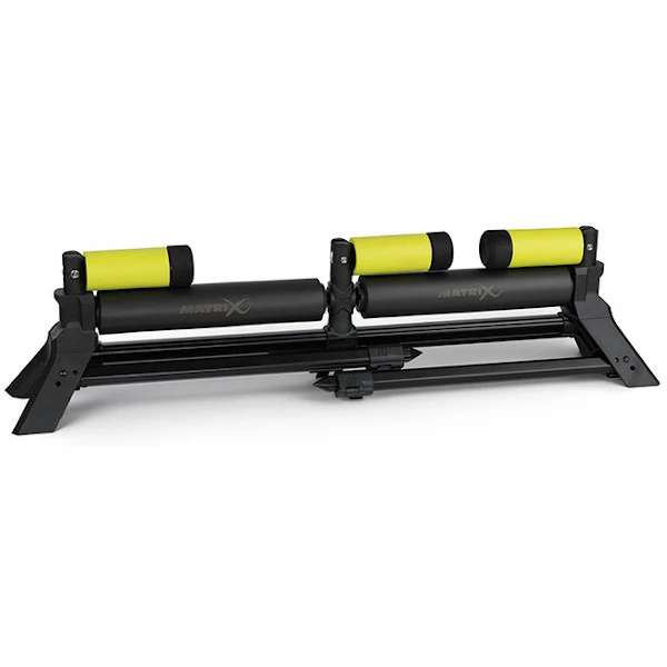 A larger version of the Matrix compact roller with a central dividing roller in the middle. Ideal for venues where you’ll be double shipping, where the divider prevents any clashing of sections when your shipping back. Featuring sturdy oversized extending legs that fold back neatly underneath, and can be used with the Matrix roller leg extensions. With super soft extruded EVA rollers and foldable uprights topped with EVA caps. Supplied with its own storage bag Â