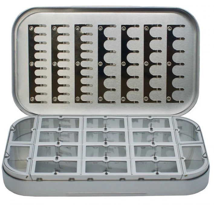 These popular 6-inch aluminium boxes from Richard Wheatley were first introduced back in 1908 and have remained a firm favourite ever since. The unique method of housing flies in individual compartments, each with its own spring-loaded window, gives a safe and reliable method of storage. Please select how many compartments, and whether you would like clips in the lid or foam  by using the drop-down box. There’s also a 16 compartment lid option, giving you 32 compartments over all.